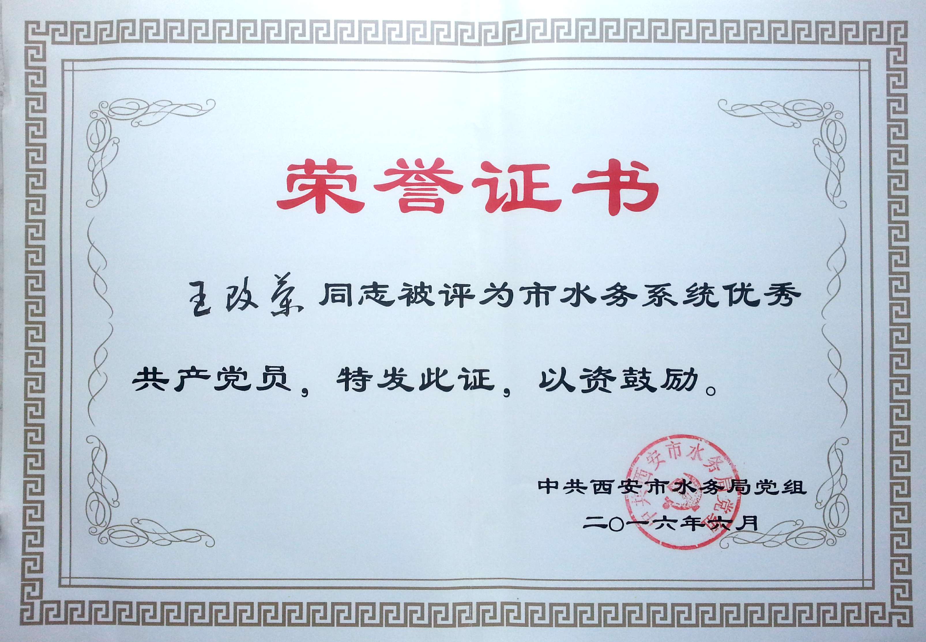 我單位王改榮同志,在2016年6月6日被中共西安市水務(wù)局黨組評為市水務(wù)系統(tǒng)優(yōu)秀共產(chǎn)黨員。