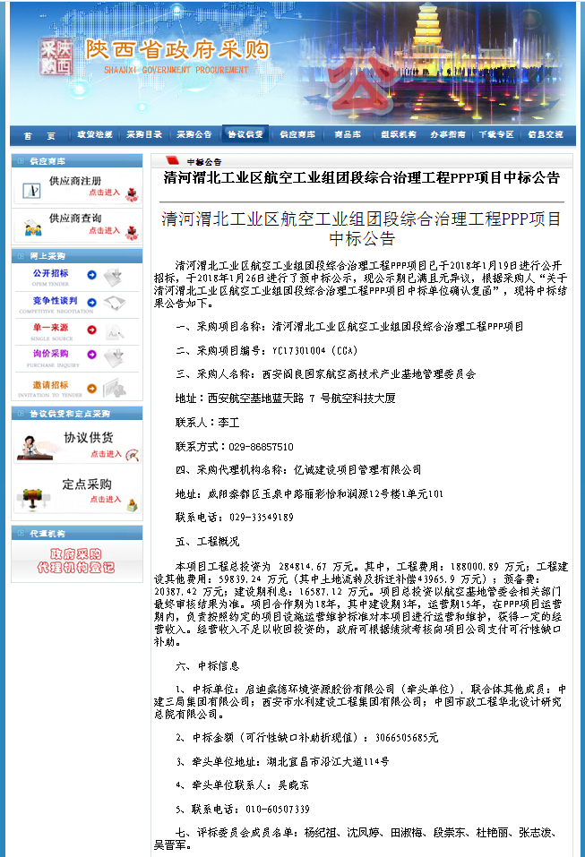 清河渭北工業(yè)區(qū)航空工業(yè)組團(tuán)段綜合治理PPP項(xiàng)目于2018年1月19日進(jìn)行了公開招標(biāo),經(jīng)評(píng)標(biāo)委員會(huì)評(píng)審,推薦以啟迪桑德環(huán)境資源股份有限公司牽頭,與中建三局集團(tuán)有限公司、西安市水利建設(shè)工程集團(tuán)有限公司、中國(guó)市政工程華北設(shè)計(jì)研究總院有限公司組成的聯(lián)合體中標(biāo)。
